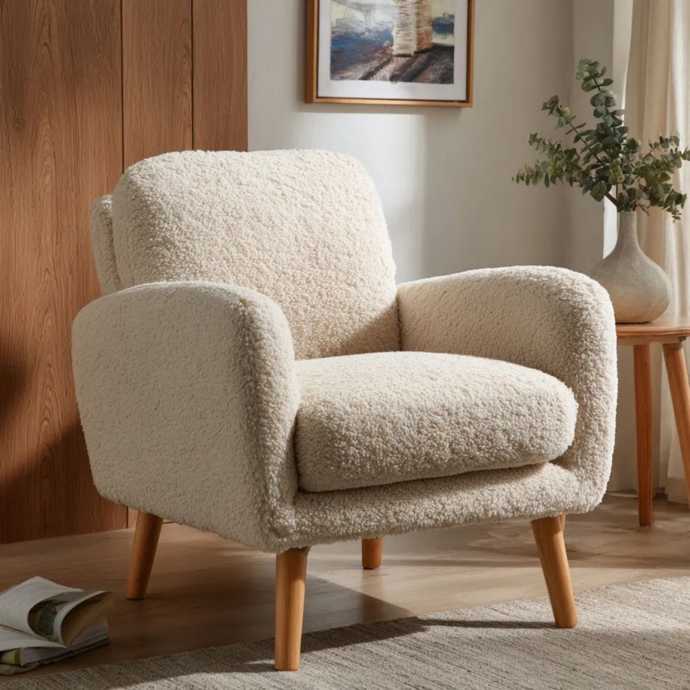 Materiale e Artigianato Rivestita in morbido tessuto Sherpa di colore Crema, questa poltrona offre una sensazione di calore e comfort. Le gambe in legno aggiungono un tocco naturale e robustezza alla struttura.